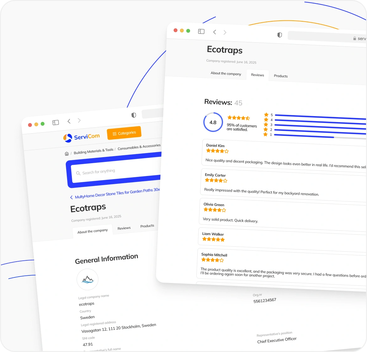 Arbeta med betrodda säljareEndast företag som verifierats genom det officiella statliga registret får sälja på plattformen. Köpare har tillgång till all relevant information: företagsregistreringsuppgifter, erfarenhet, betyg och recensioner.